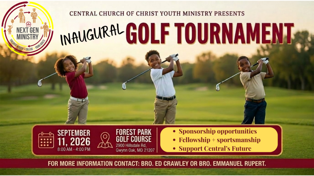 An exciting ‘first’ is coming to the congregation on Friday, September 11th: our Inaugural Gold Tournament! The Central Church of Christ Youth Ministry will be sponsoring this event at Forest Park Golf Course from 8am to 4pm.