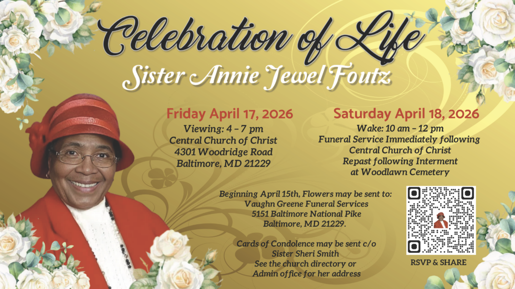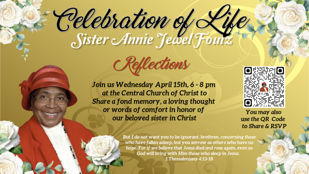 The celebration of life services for Sis. Annie Jewel Foutz will be held Friday, April 17 – Saturday, April 18. There will also be a reflections session on Wednesday, April 15, 6-8pm, at the building. Information for these services, as well as information on sending cards and flowers, can be found in the flyer linked in the button below. You can use the QR code in the flyer (or click the button below) to RSVP for the funeral services and repast, and to share fond memories, words of comfort, or pictures of Sis. Foutz. Lastly, please pray for one another, the family, and the entire brotherhood in our loss.