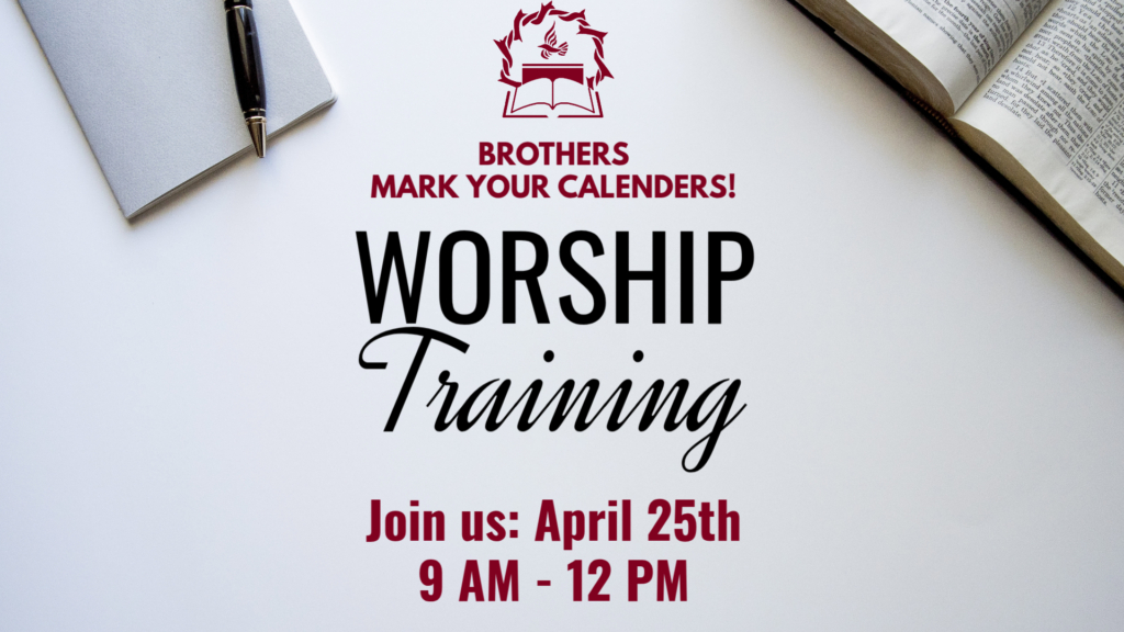 Brothers, mark your calenders! We will be holding a worship training on Saturday, April 25 at 9am-12pm.