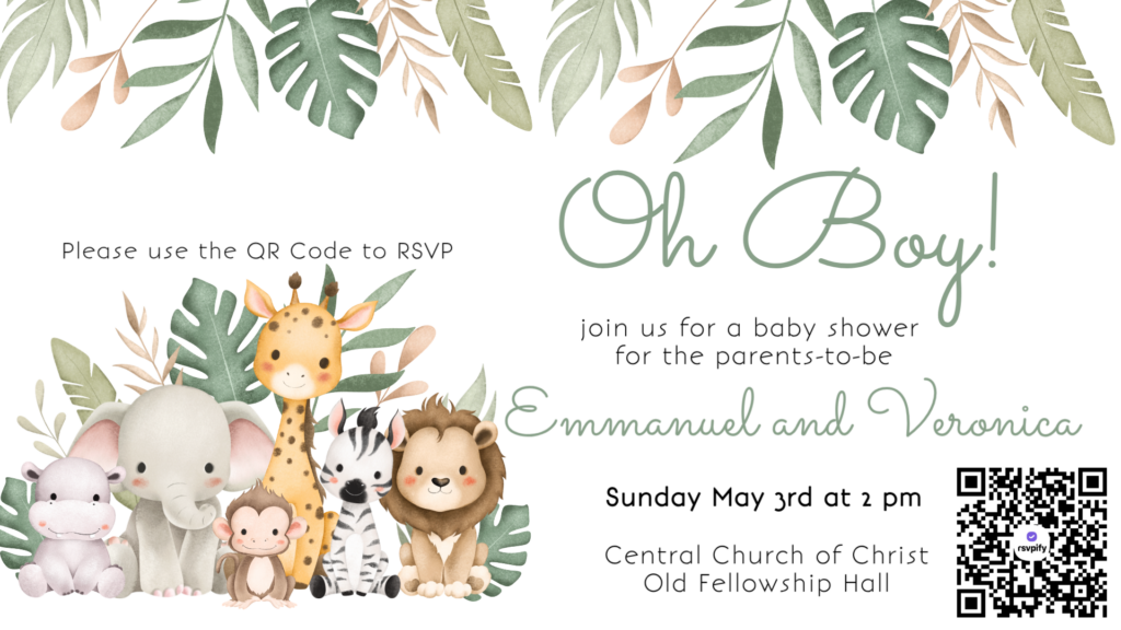 We will be celebrating with the parents-to-be, Bro. and Sis. Emmanuel and Veronica Rupert on Sunday, May 3rd at 2pm in the Old Fellowship Hall. Join us!