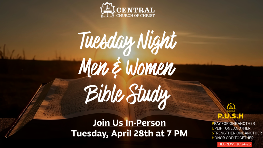 Please join us for an in-person edition of our Men’s and Women’s Bible Studies on Tuesday, April 28 at 7pm at the building.