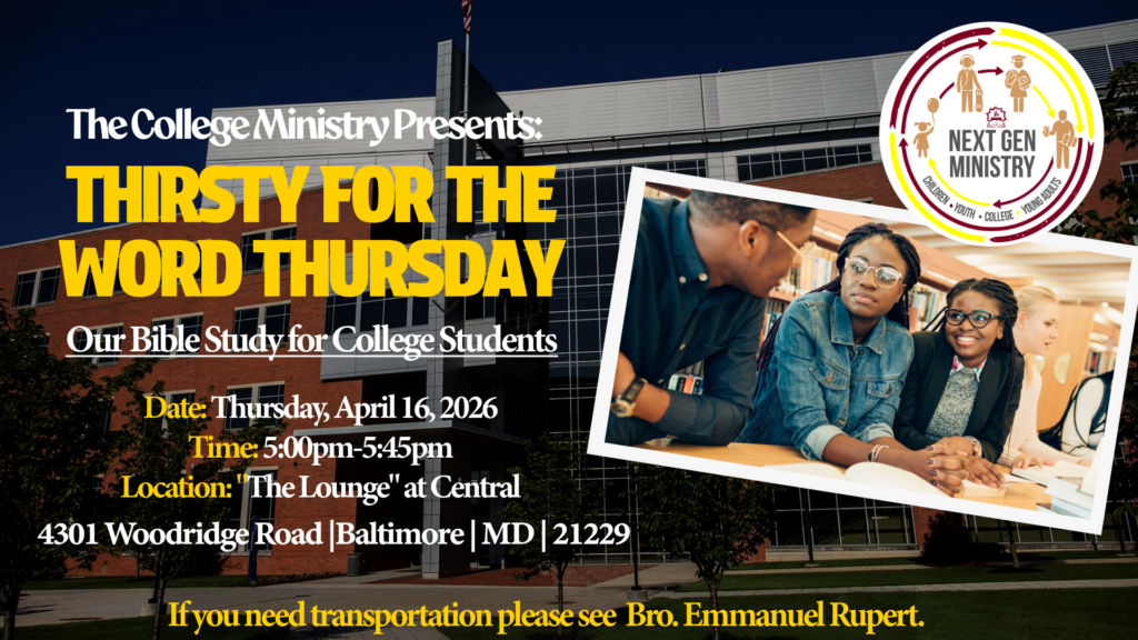 Thirsty For The Word Thursday is our Bible study for ALL college students! Join us this Thursday, April 16 at 5pm at the building in The Lounge on the 3rd floor.