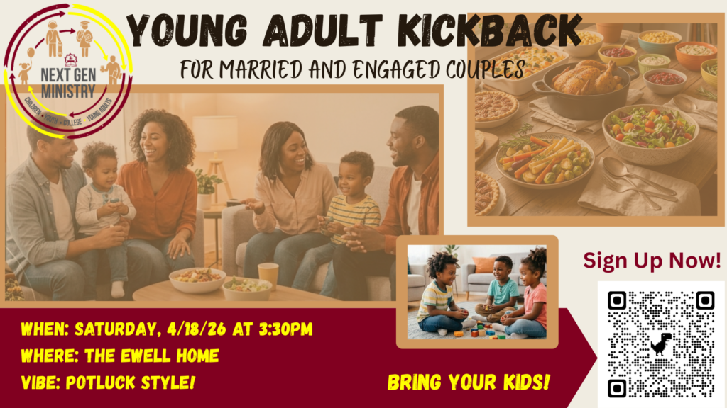 If you are a married or engaged young adult, please join us for a kickback on Saturday, April 18 at 3:30pm! This event will be held at the Ewell’s home and will feature a potluck, so bring your favorite dish to share! No need to find a babysitter — bring your kids with you! Click the button below or scan the QR code to sign up.